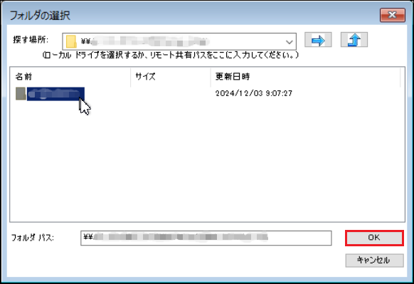 10.バックアップ先フォルダー内の復旧するサーバー名のフォルダーを選択し、[OK]をクリックします。