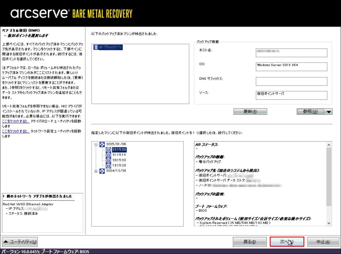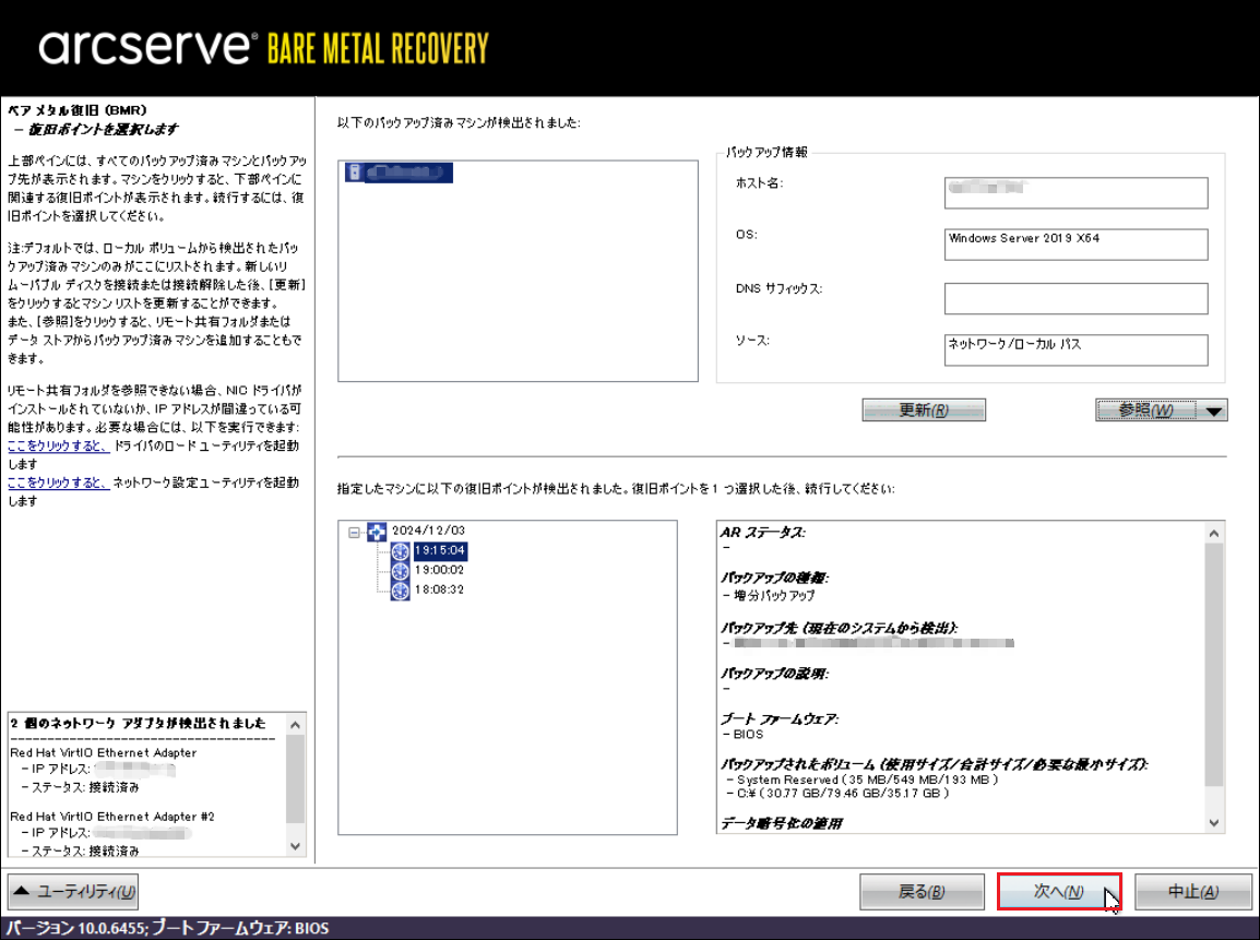 11.下記のような画面にバックアップファイル情報が表示されます。[次へ]をクリックします。