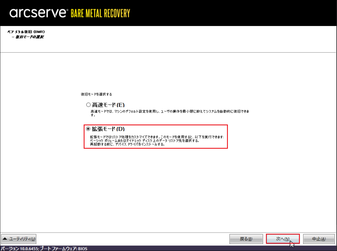 16.下記画面に戻るので[拡張モード]を選択し、[次へ]をクリックします。