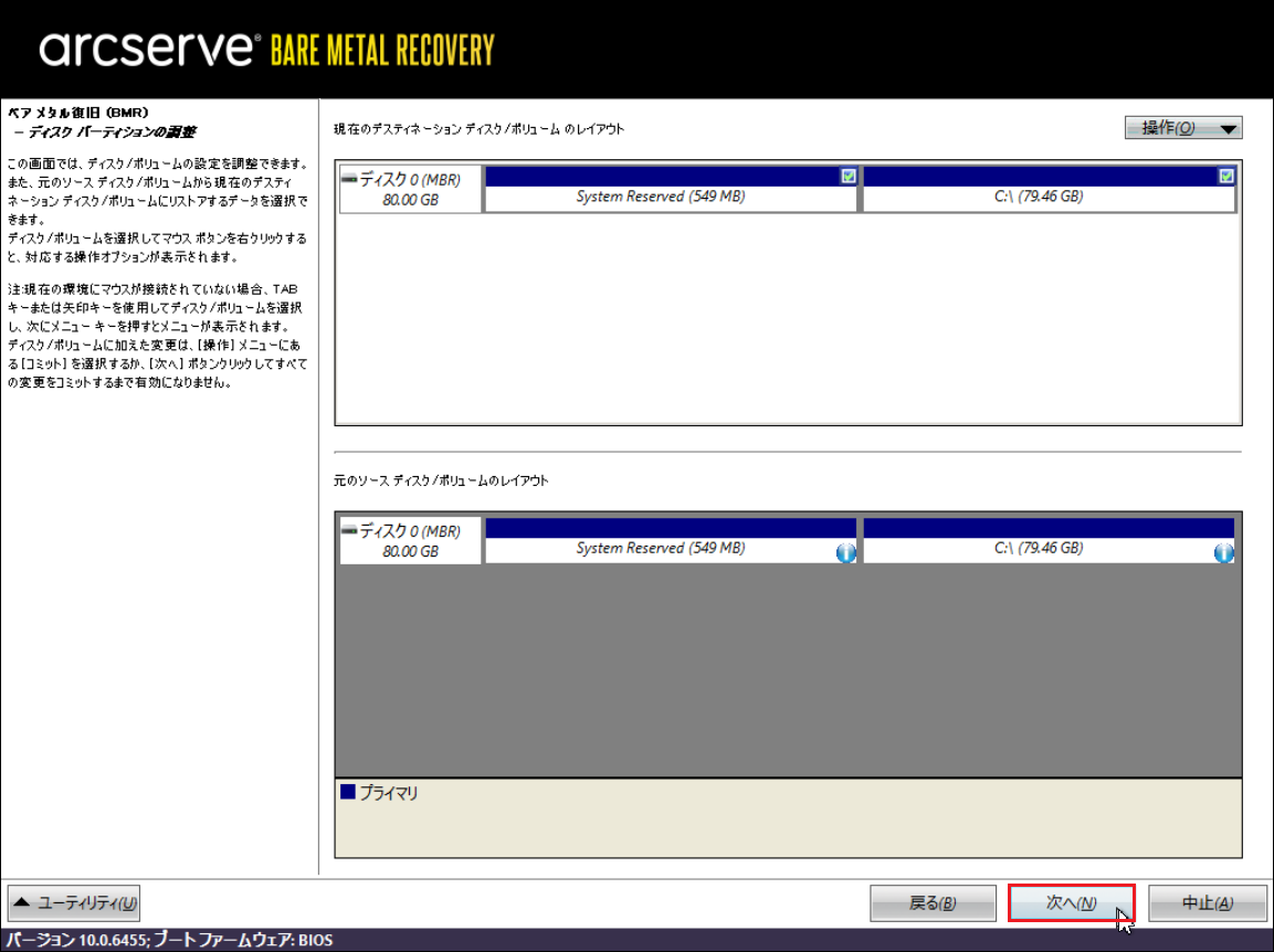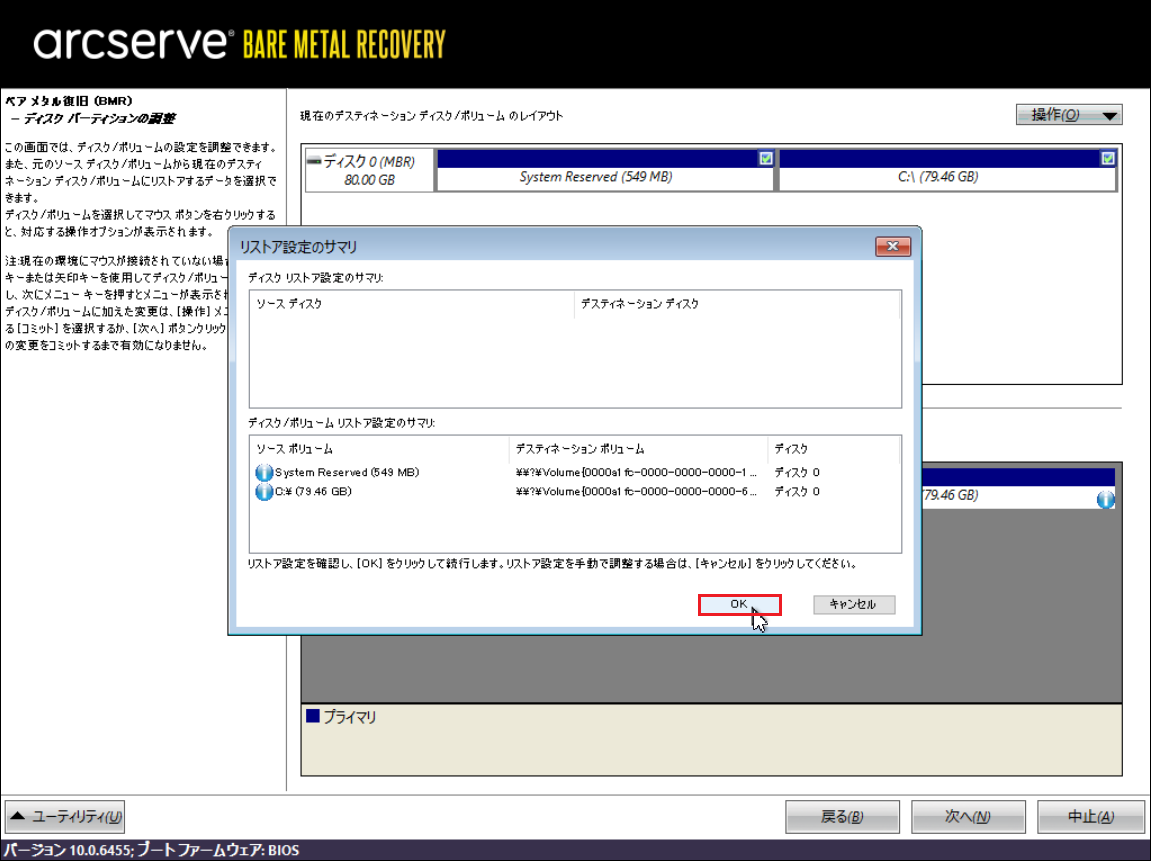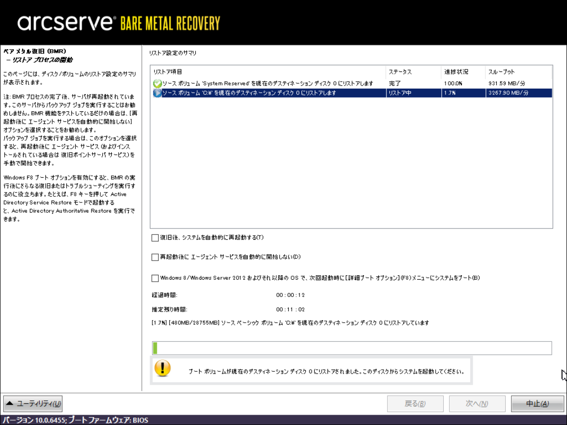 ※ここからArcserveの機能でバックアップファイルから上記の空ボリュームにデータをリストアします。