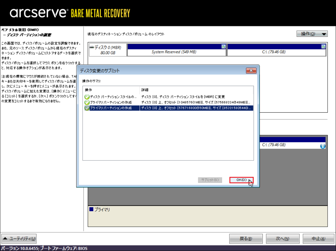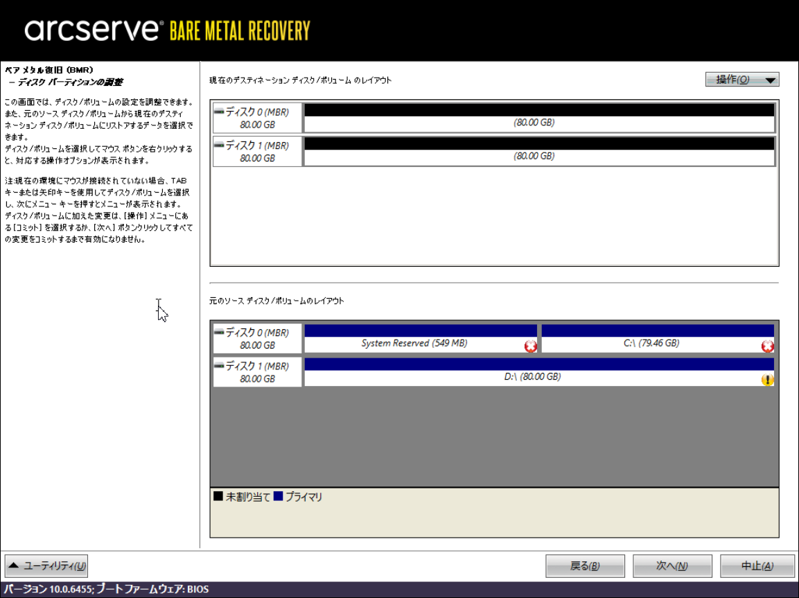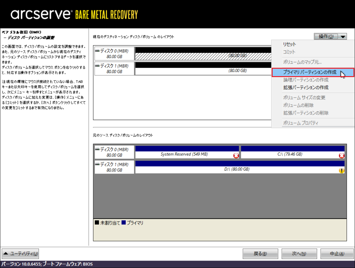 20.その場合は、上段のリストア先ディスク/ボリュームで設定するボリュームを選択した後、[操作]から[プライマリパーティションの作成]を選択して、バックアップデータをすべて設定してください。