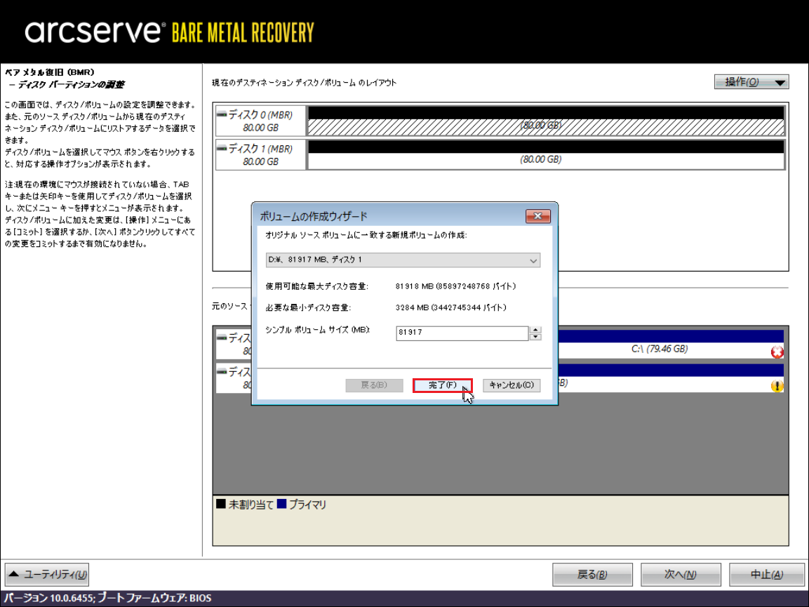 21.「ボリュームの作成ウィザード」画面で、設定するバックアップディスク/ボリュームを選択し、[完了]をクリックします。