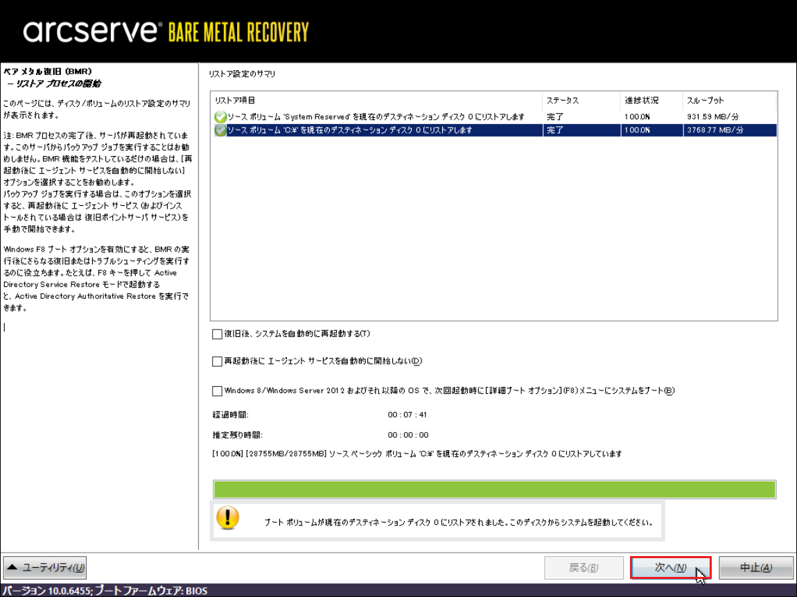 27.リストアが完了すると[次へ]ボタンがアクティブになるので、クリックします。