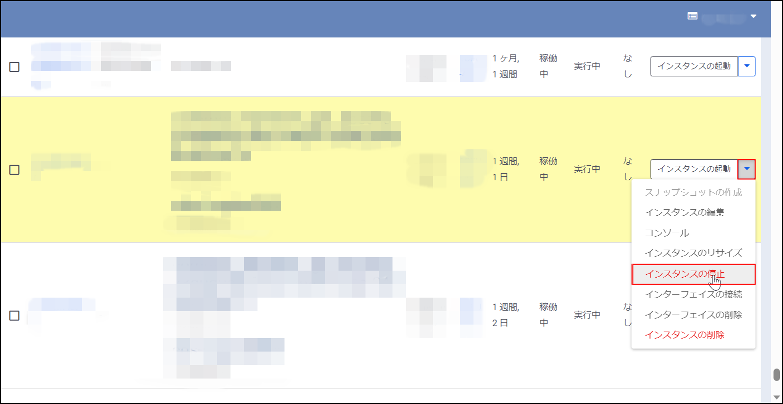 [サーバーインスタンス]—[インスタンス]にてこのRocky Linuxインスタンスがシャットダウン済みになっていることを確認してください。