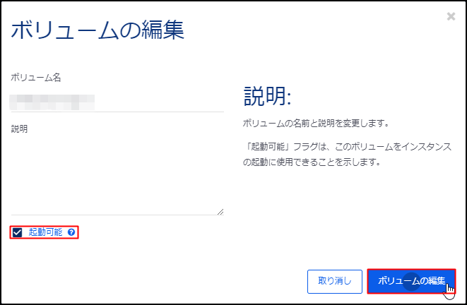 6.[起動可能]のチェックを外し、[ボリュームの編集]をクリックします。