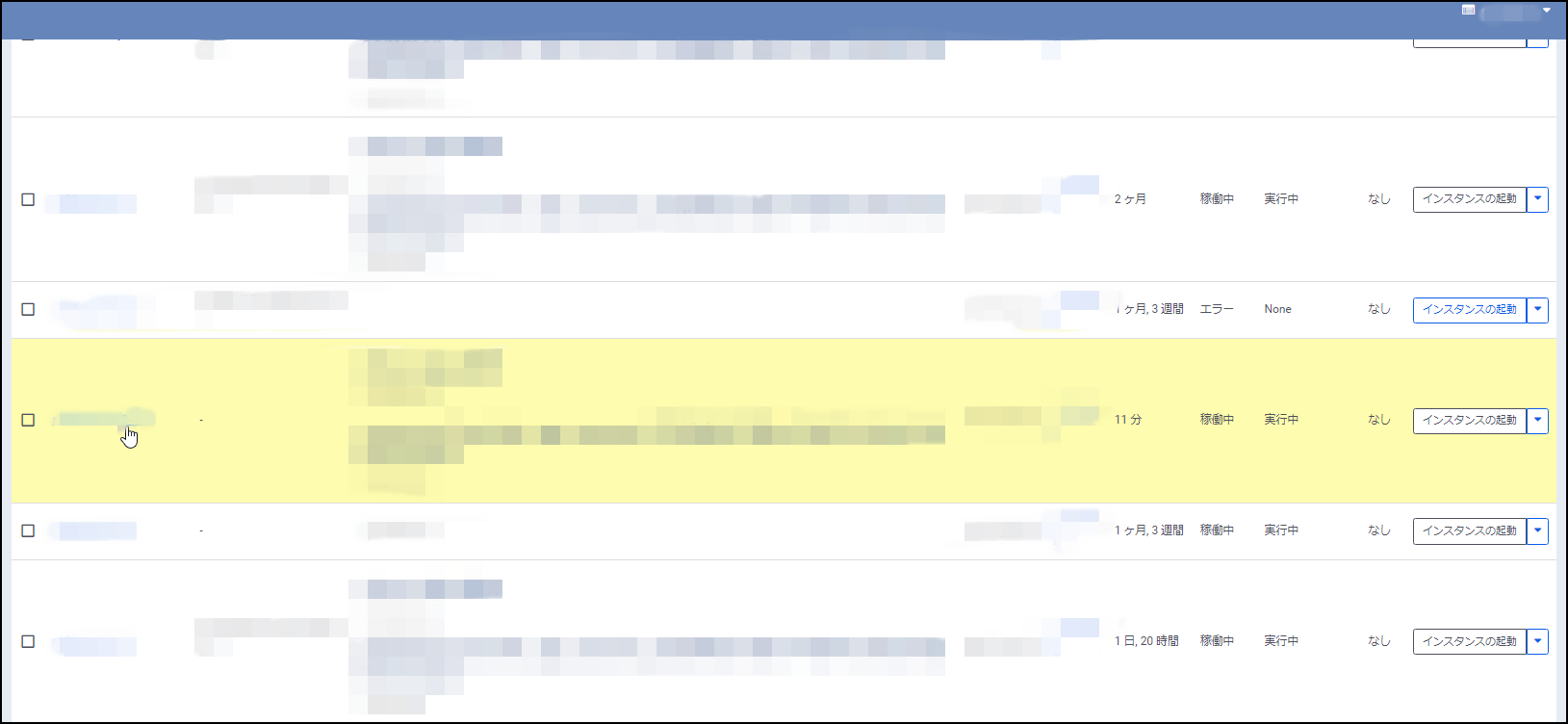 1.リストア用の一時インスタンスを起動し、インスタンス名の項目をクリックして「インスタンス」画面を表示します。