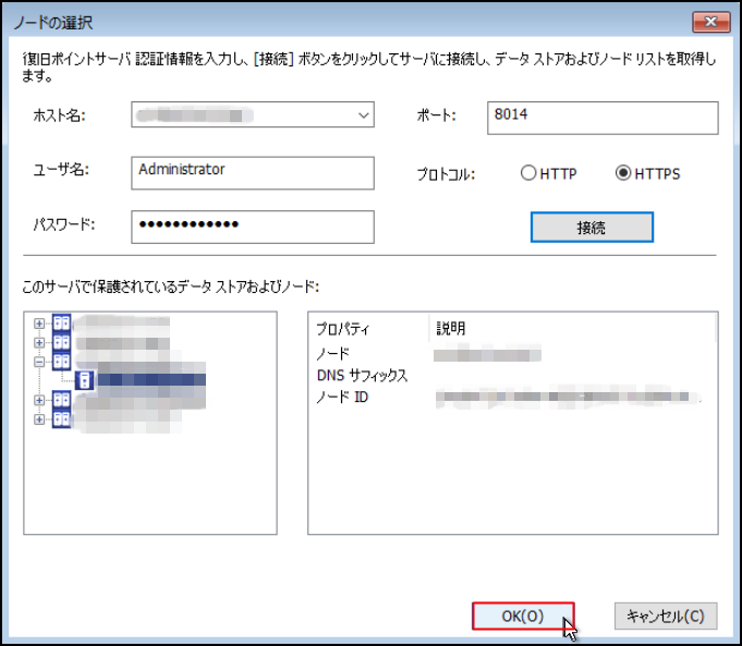 14.「データストア」を選択すると「ノード」が表示されるので、リストアする[ノード]を選択し、[OK]をクリックします。