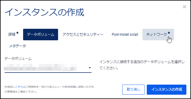 [サーバーインスタンス]—[ボリューム]—[ボリュームの作成]をクリックします。