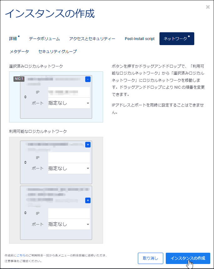 5.利用可能なロジカルネットワークからこのインスタンスに設定するIPアドレスを選択し、選択済みロジカルネットワークにIPアドレスを設定します。
