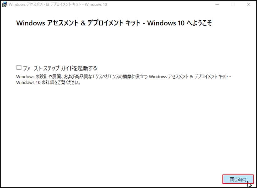 10.インストール完了後、「Windows アセスメント & デプロイメント キット - Windows 10 へようこそ」画面にて、[閉じる]をクリックします。