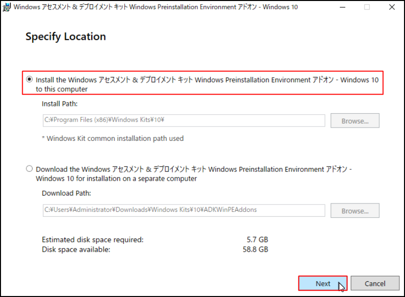 12.[Install the Windows アセスメント & デプロイメントキット Windows Preinstallation Environment アドオン - Windows 10 to this computer]を選択し、[Next]をクリックします。