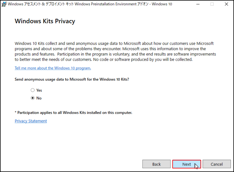 13.「Windows Kits Privacy」画面にて必要に応じ、[Yes]または[No]を選択し、[Next]をクリックします。