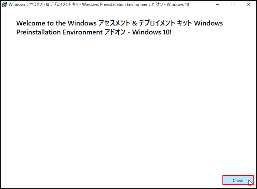 16.「Welcome to the Windows アセスメント & デプロイメント キット Windows Preinstallation Environment アドオン - Windows 10!」画面が表示されたら、[Close]をクリックします。