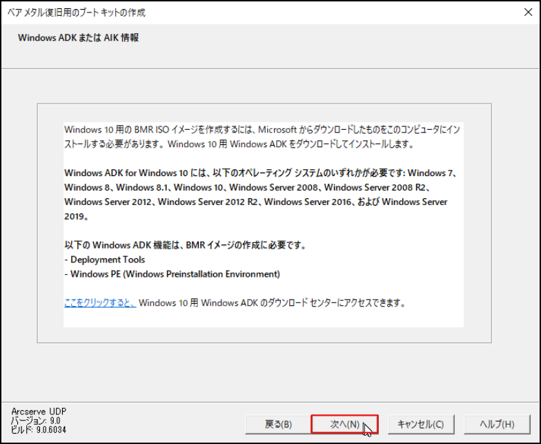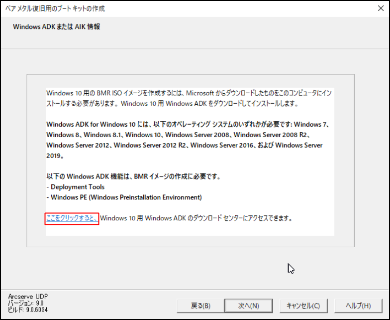 Windows ADK(Windows アセスメント & デプロイメント キット)または Windows AIK(Windows 自動インストール キット)がインストールされていない場合は、「Windows ADK または AIK 情報」画面が表示されます。