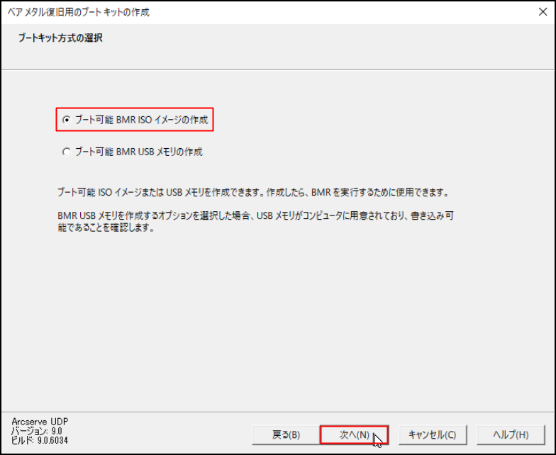18.「ブートキット方式の選択」画面にて、[ブート可能 BMR ISOイメージの作成]を選択し、[次へ]をクリックします。