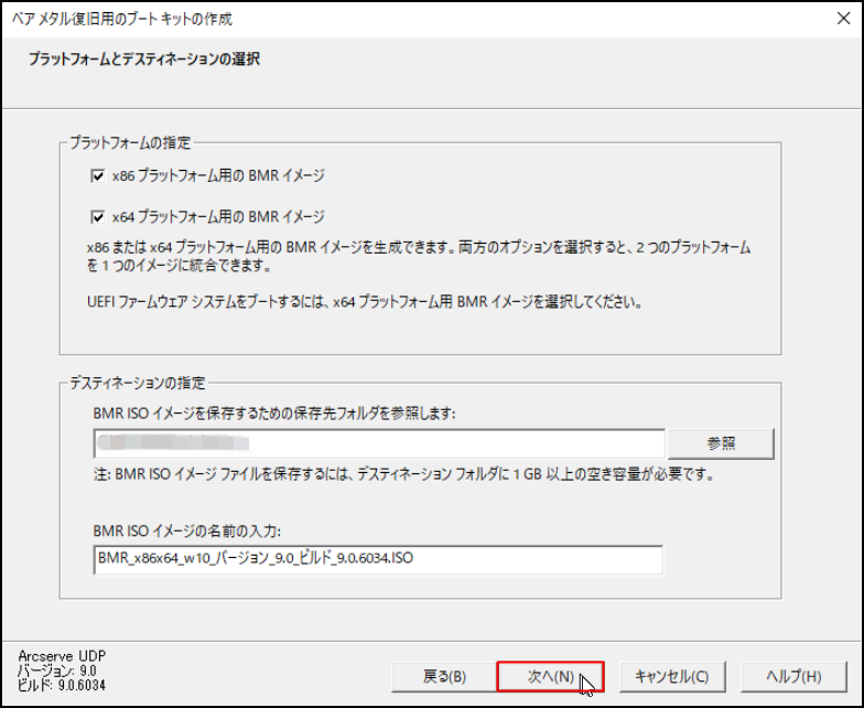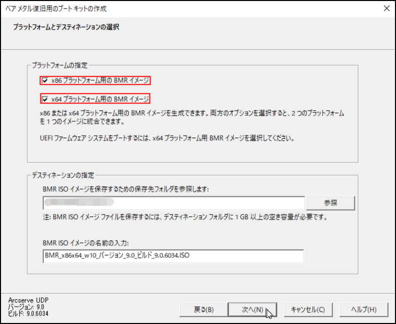 20.「プラットフォームとデスティネーションの選択」画面の「デスティネーションの指定」にて、「BMR ISOイメージを保存するための保存先フォルダーを参照します」および「BMR ISO イメージの名前の入力」でそれぞれを指定し、[次へ]をクリックします。