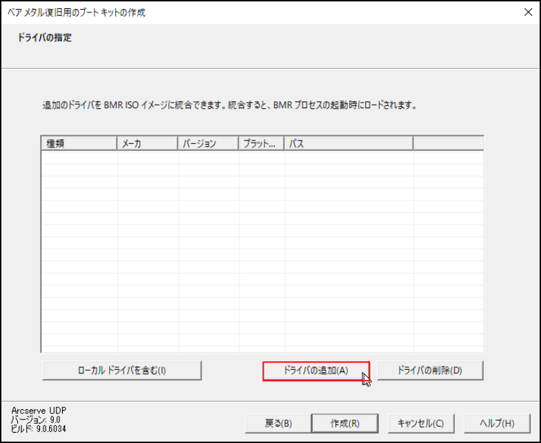 ※ドライバーを組み込んだ BMR ISO イメージを作成する場合は、[ローカルドライバーを含む]または[ドライバーの追加]を選択し、ドライバーを導入します。