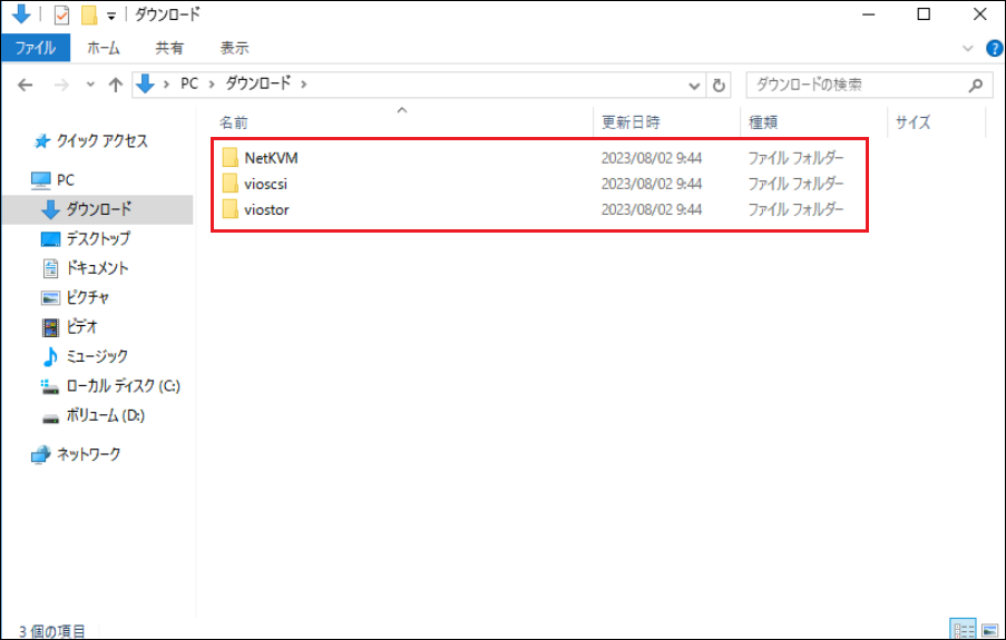 ・ネットワーク ←ドライバーISOファイル内の「NetKVM」フォルダー(ファイル一式)