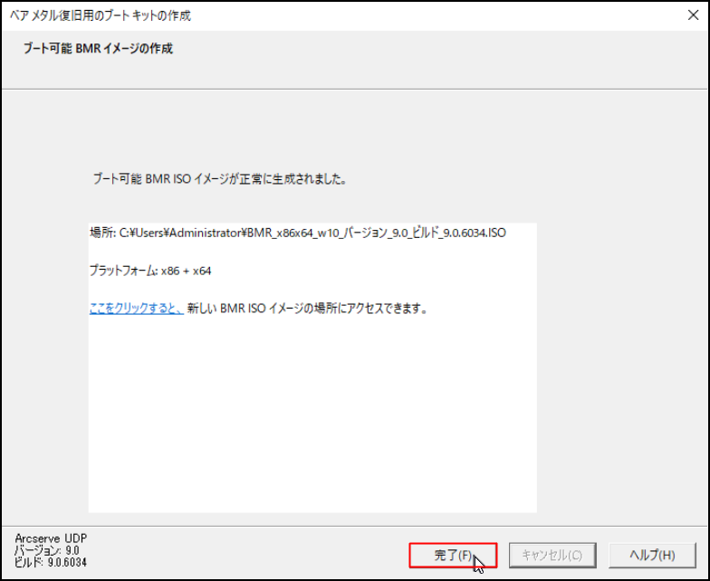 24.「ブート可能 BMR イメージの作成」画面にて、BMR ISOイメージの作成が完了すると以下の画面が表示されます。