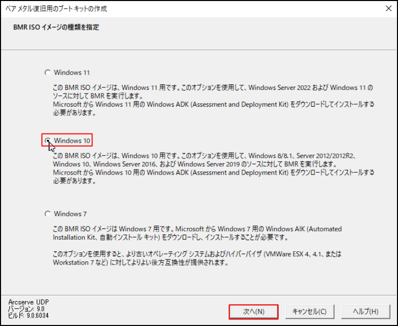 2.「BMR ISO イメージの種類を指定」画面で、該当するものを選択し、[次へ]をクリックします。