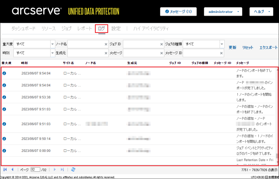 3.Arcserve UDPコンソール画面で、[ログ]をクリックし、メッセージに現在のArcserveのバージョンが表示されていること、過去のログが表示されているかを確認します。