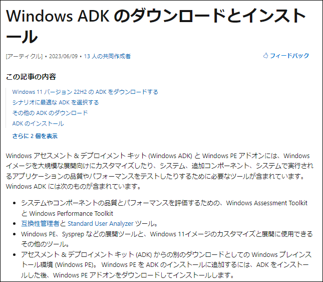 4.Microsoft社のWebページ「Windows ADK のダウンロードとインストール」(https://docs.microsoft.com/ja-jp/windows-hardware/get-started/adk-install)が開きます。