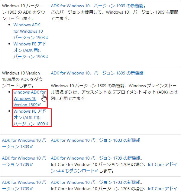 ADKをダウンロードします。[Windows ADK for Windows 10 バージョン 1809 のダウンロード]、[ADK 用の Windows PE アドオンのダウンロード]をそれぞれクリックし、2つのファイルをダウンロードします。