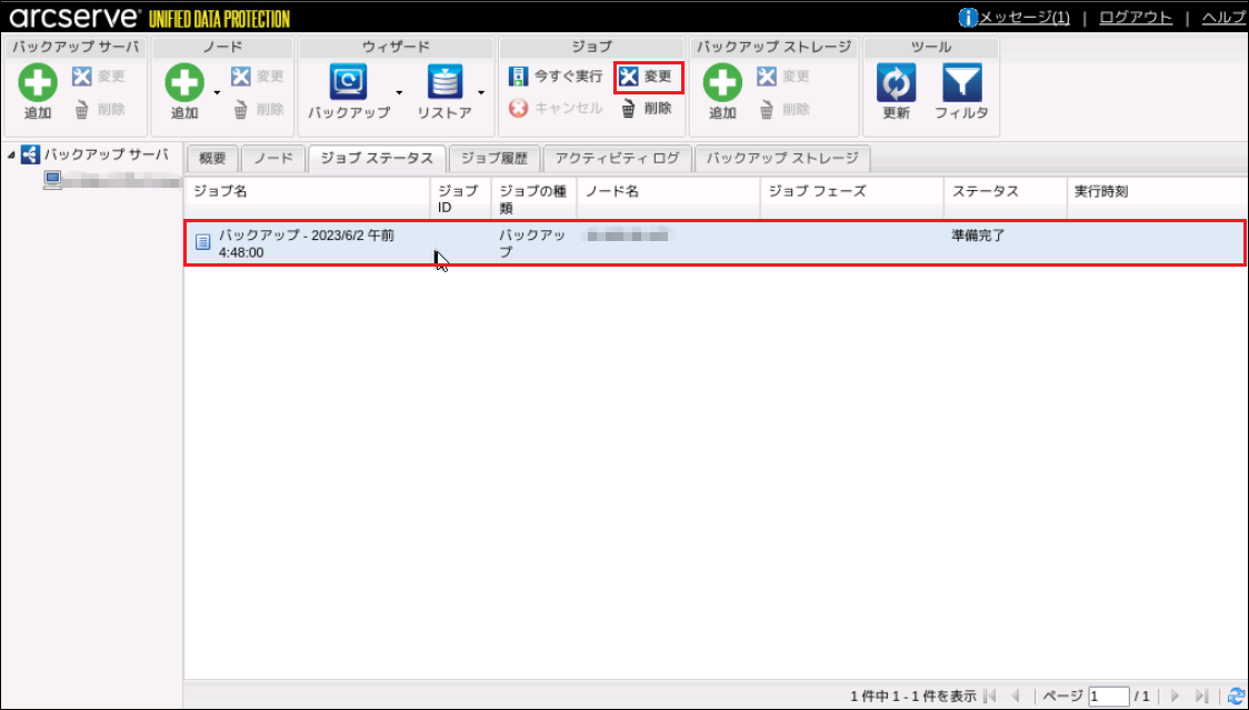 3.ログイン後、管理画面が表示されます。[ジョブステータス]—[バックアップ対象となるLinuxサーバーのバックアップ]—[変更]をクリックします。