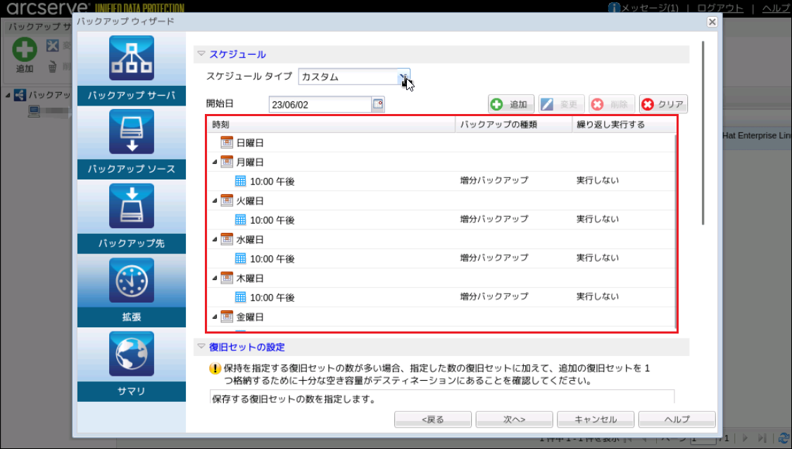 4.[バックアップジョブの変更]—[拡張]をクリックすると、スケジュール画面が表示されます。