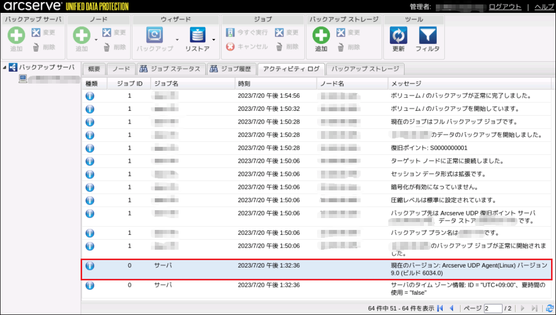 7.[アクティビティログ]タブで、アップグレード後のバックアップ対象となるLinuxサーバーのバックアップログを確認します。