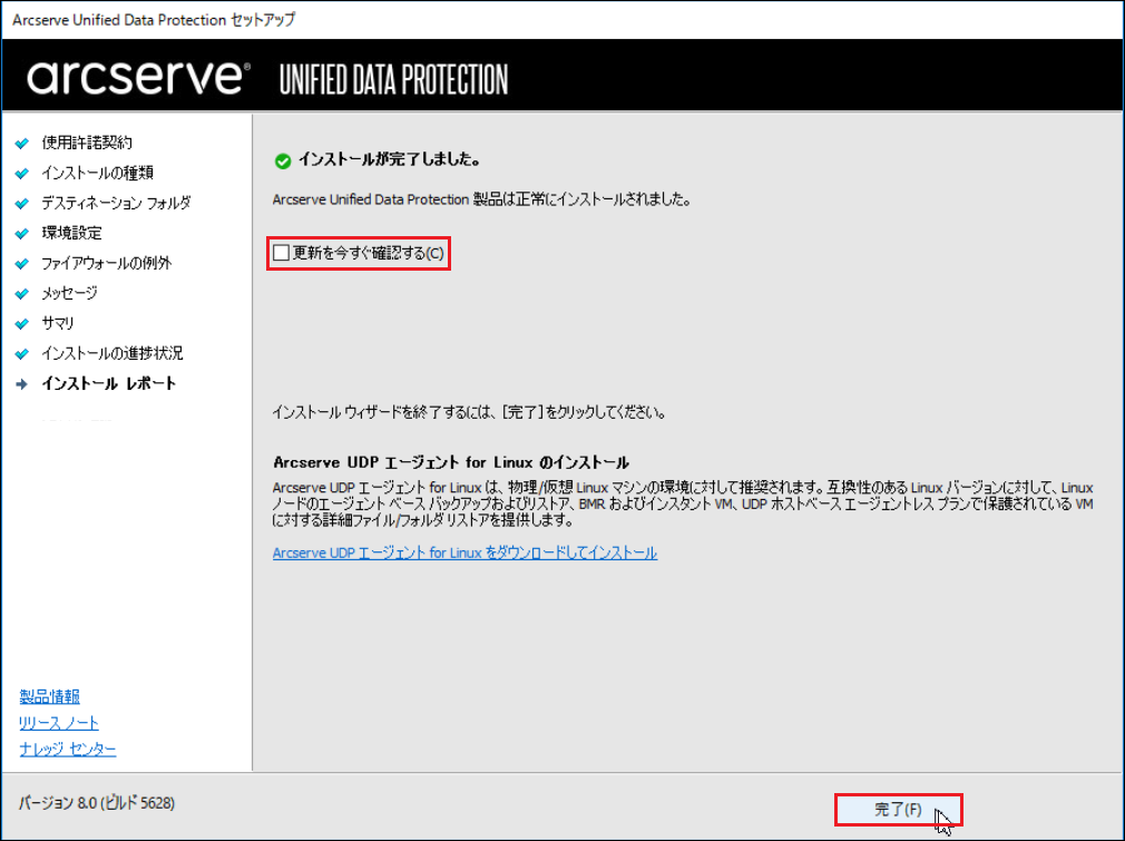 11.[更新を今すぐ確認する]にチェックが入っていない状態で、[完了]をクリックします。