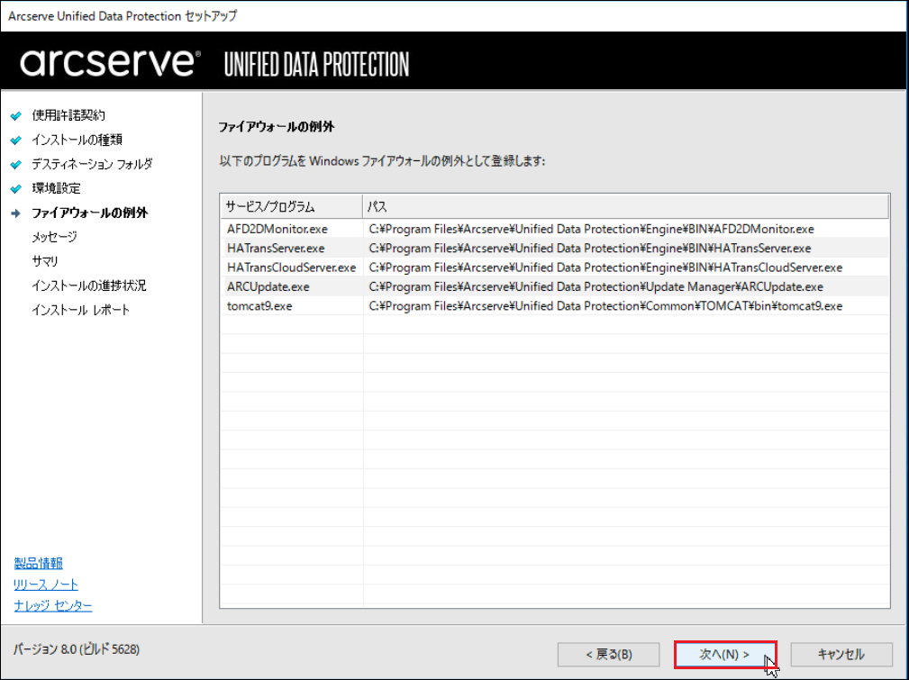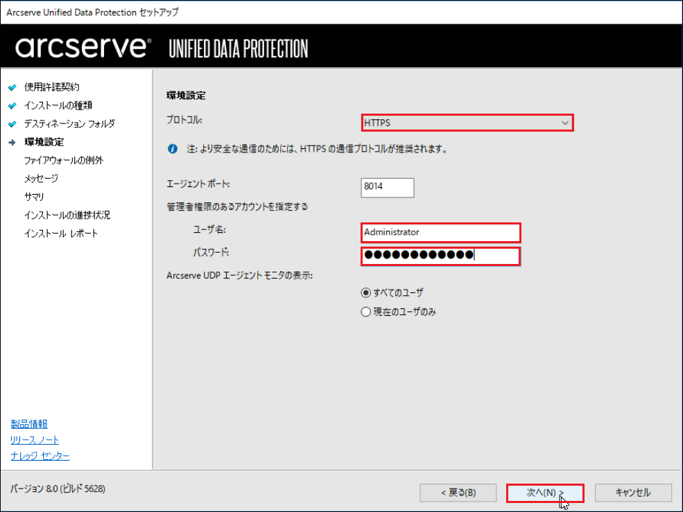 Arcserve UDP Agent(Windows)のインストールで利用可能なポート番号は1024~65535です。指定したポート番号が開いていて利用できることを確認してください。セットアップでは、利用できないポートではArcserve UDP Agent(Windows)をインストールできません。ここで登録したポート番号を使用して、Arcserve UDP Agentをリモートのブラウザーからも操作できます。