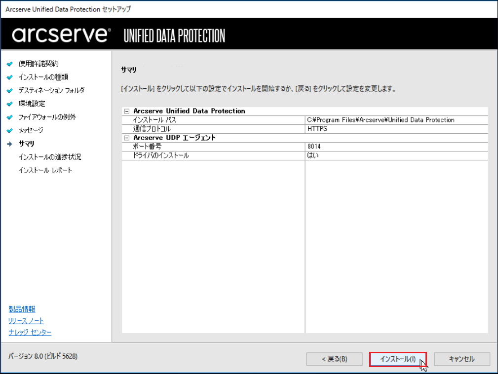 9.サマリー画面が表示されます。[インストール]をクリックします。