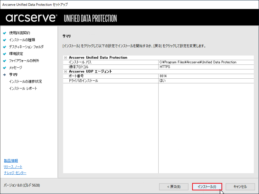 10.サマリー画面が表示されます。[インストール]をクリックします。