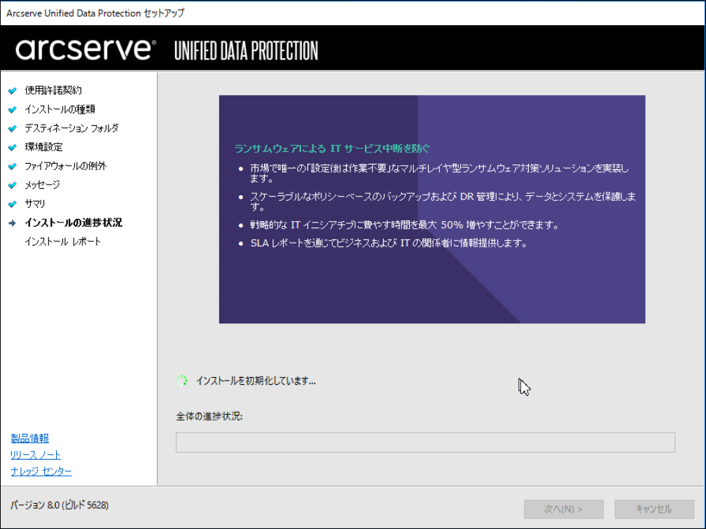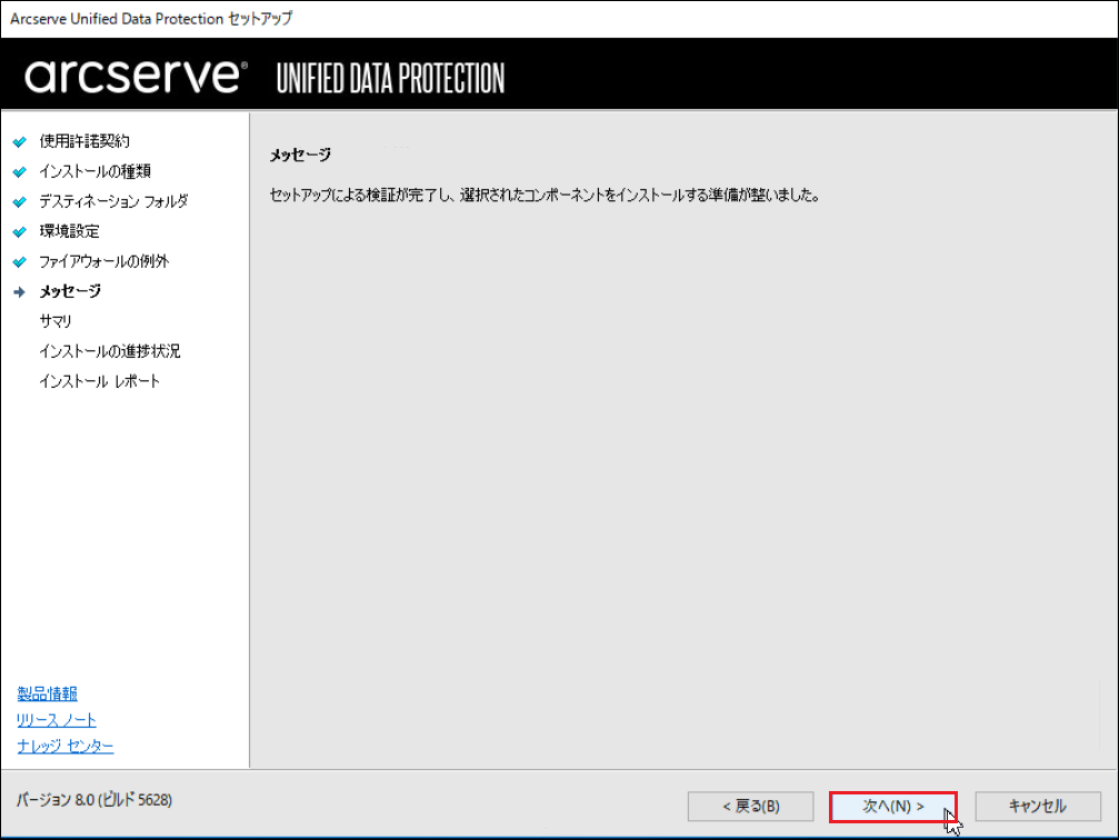 9.セットアップの検証が完了し、インストールの準備が整うと、以下の画面が表示されます。