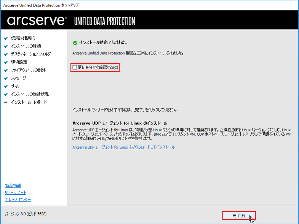 12.[更新を今すぐ確認する]にチェックが入っていない状態で、[完了]をクリックします。