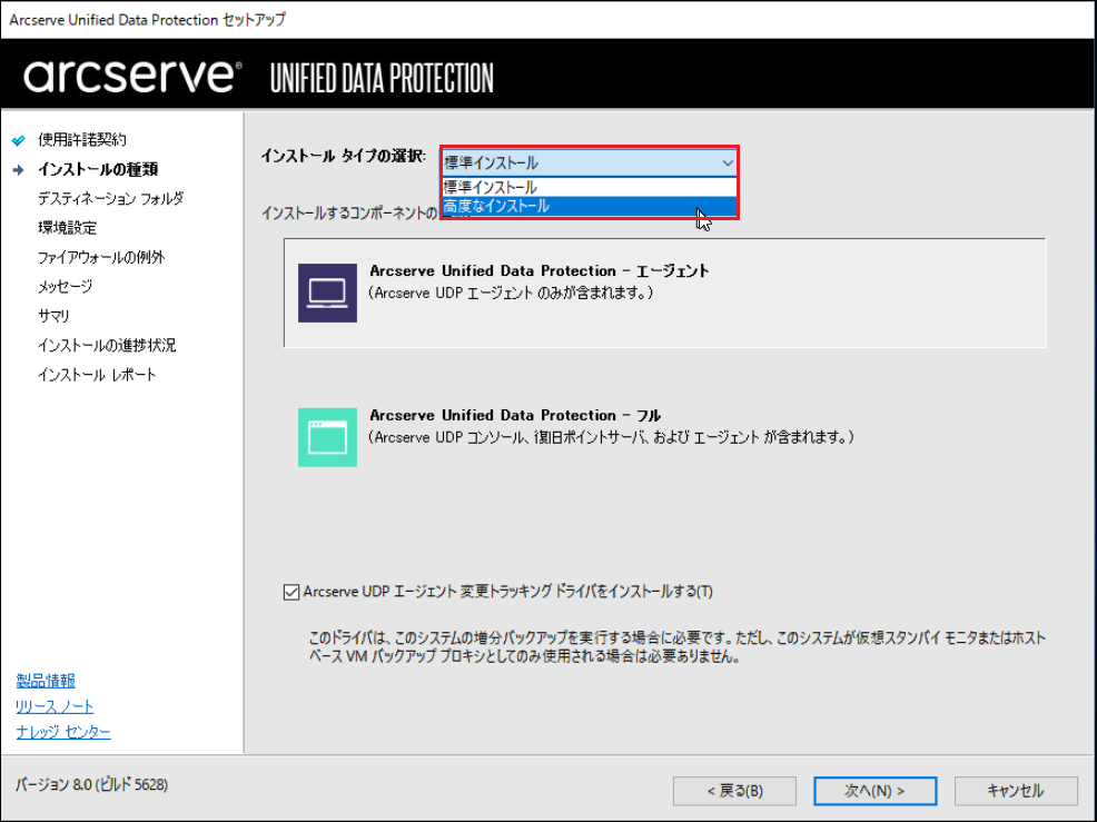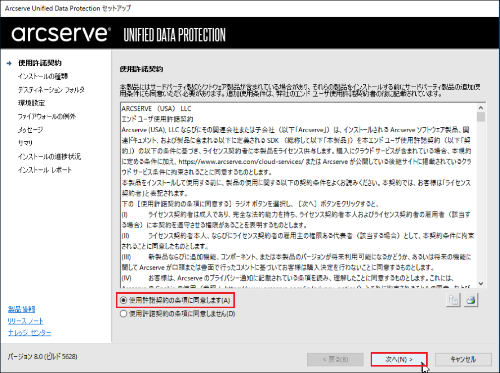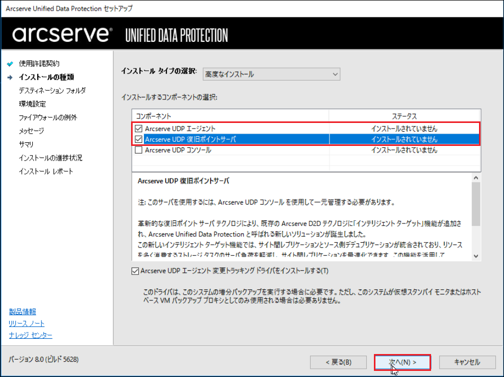 5.[Arcserve UDPエージェント][Arcserve UDP復旧ポイントサーバ]にチェックを入れ、[次へ]をクリックします。