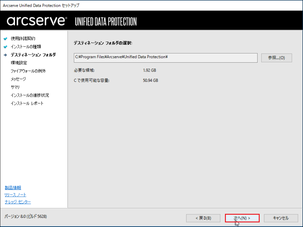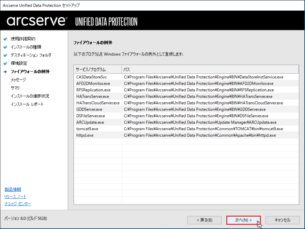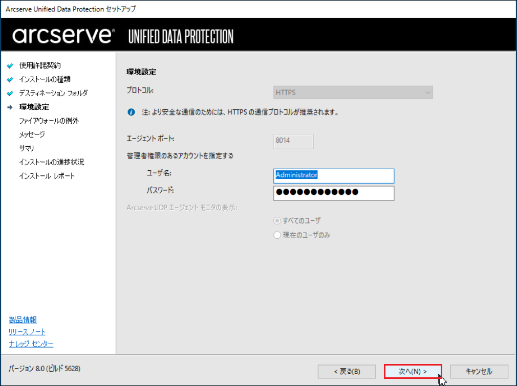Windowsのインストールで利用可能なポート番号は1024~65535です。指定したポート番号が開いていて利用できることを確認してください。セットアップでは、利用できないポートではインストールできません。ここで登録したポート番号を使用して、Arcserveをリモートのブラウザーからも操作できます。