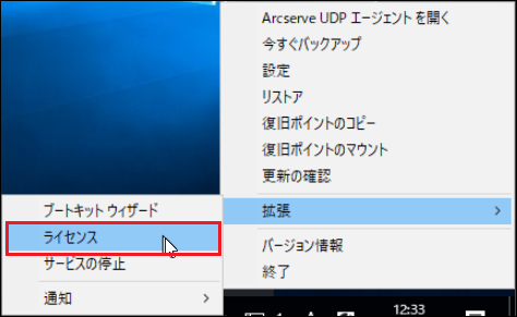 インストール後、管理者権限のあるユーザーでログインし、タスクトレイにあるArcserveのアイコンを右クリックし、メニューから