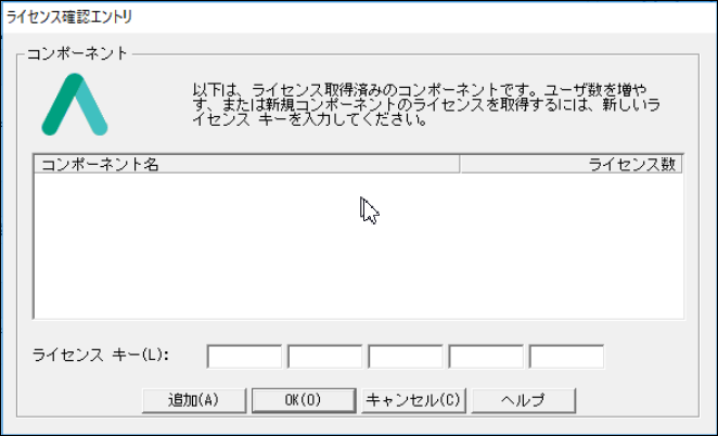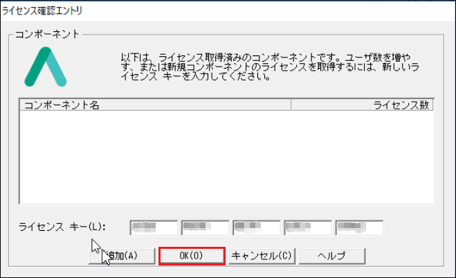 4.登録した「コンポーネント名」(製品名)と、「ライセンス数」を確認し、[OK]をクリックして画面を閉じます。