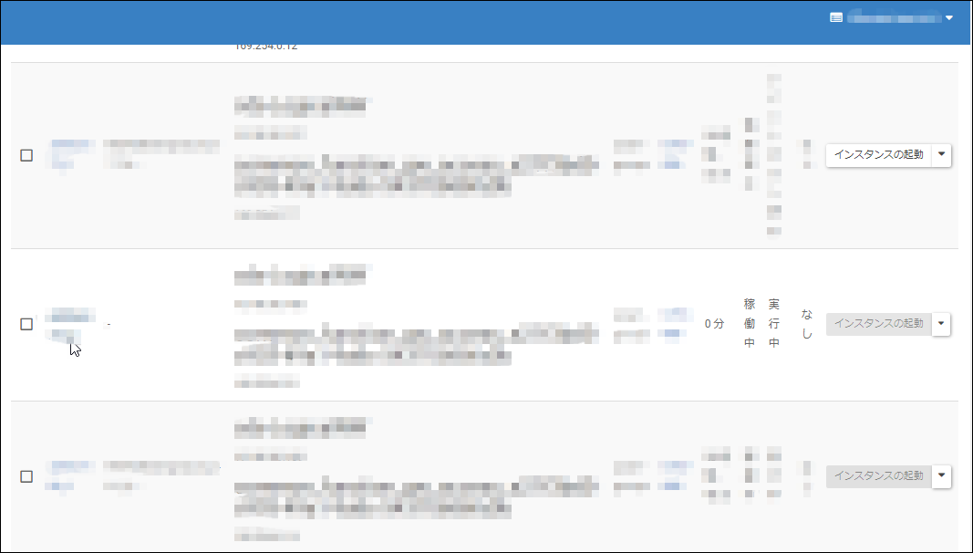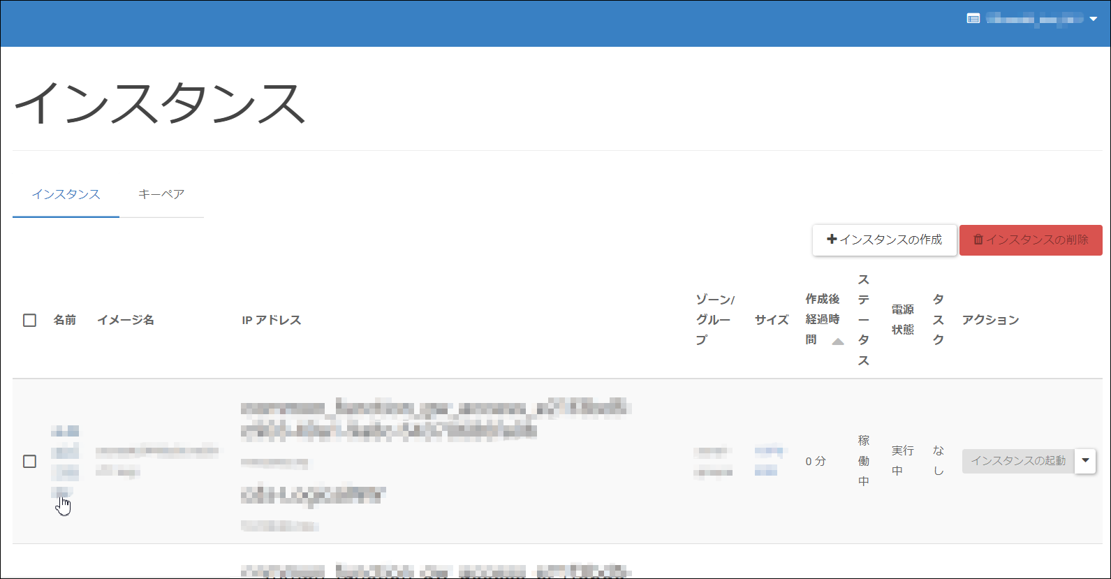 1.リストア用の一時インスタンスを起動し、インスタンス名の項目をクリックして「インスタンス」画面を表示します。