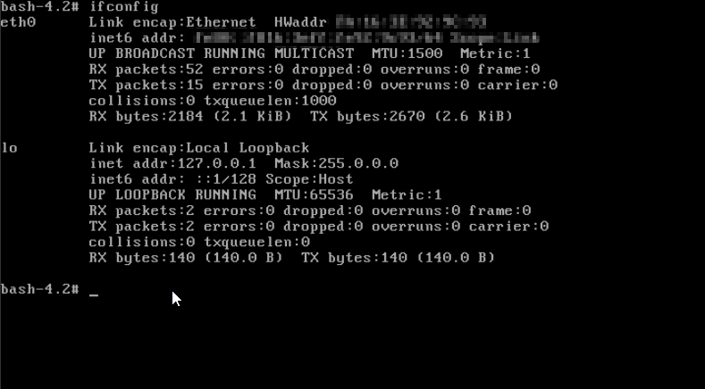 ifconfigコマンドで、IPアドレスが設定されていない状態であることを確認します。