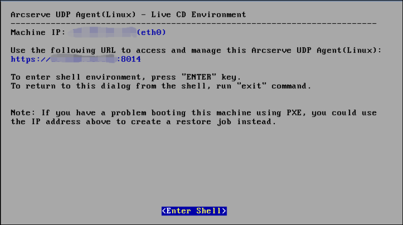 8.以下のようにIPアドレスが設定されていることと、リストア実施を設定する画面にアクセスするためのURLが表示されていることを確認します。