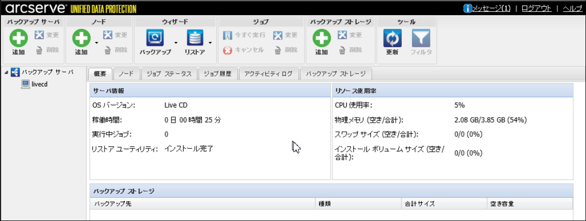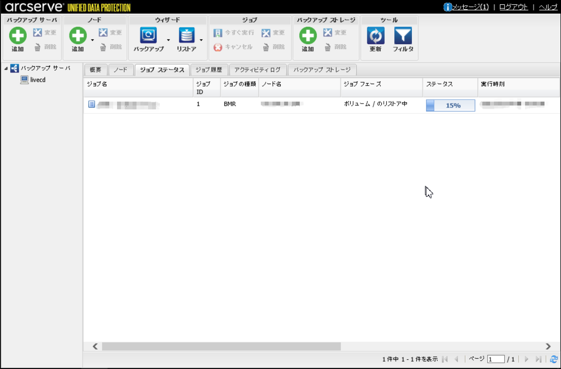 22.元の画面に戻り、[ジョブステータス]タブにてリストアジョブが実行されたことを確認します。