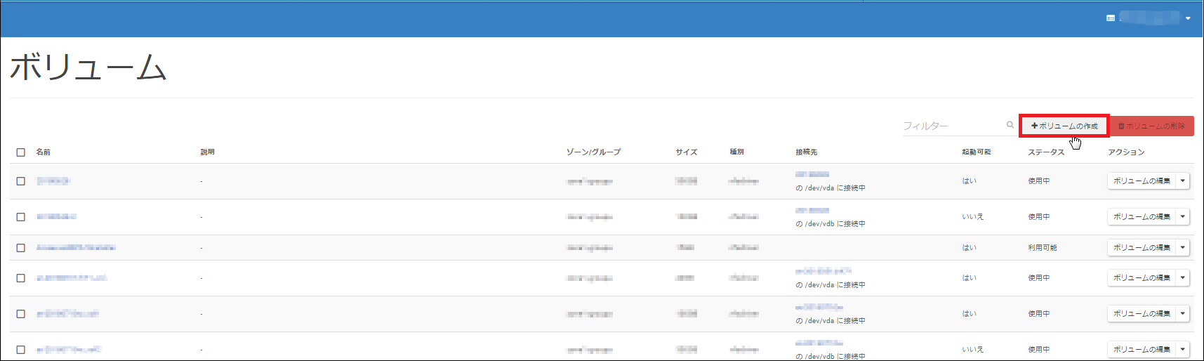 [サーバーインスタンス]—[ボリューム]—[ボリュームの作成]をクリックします。