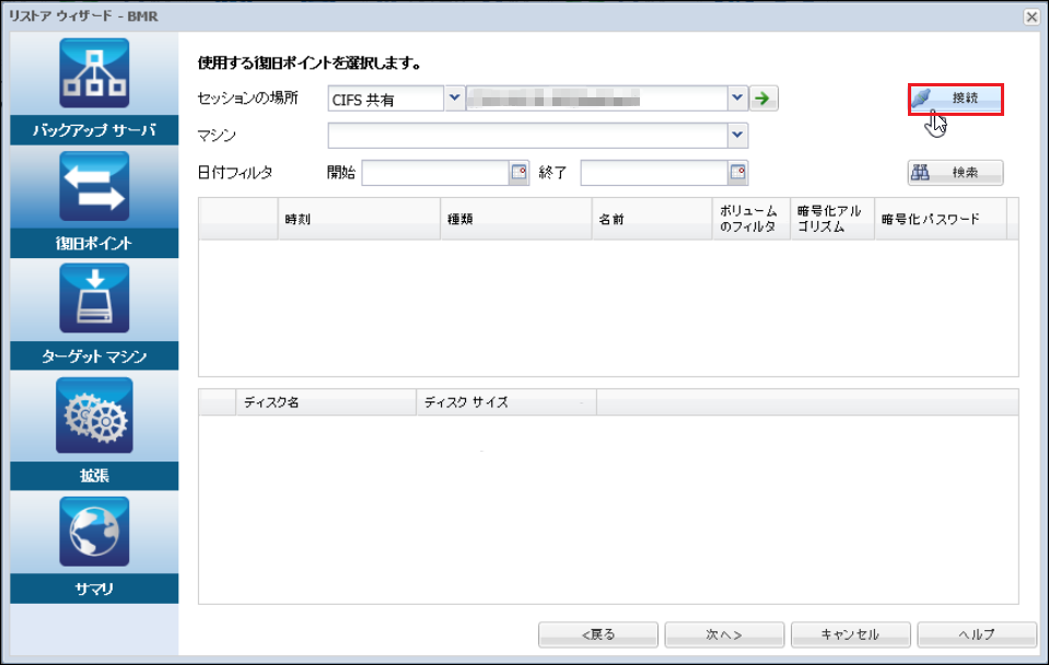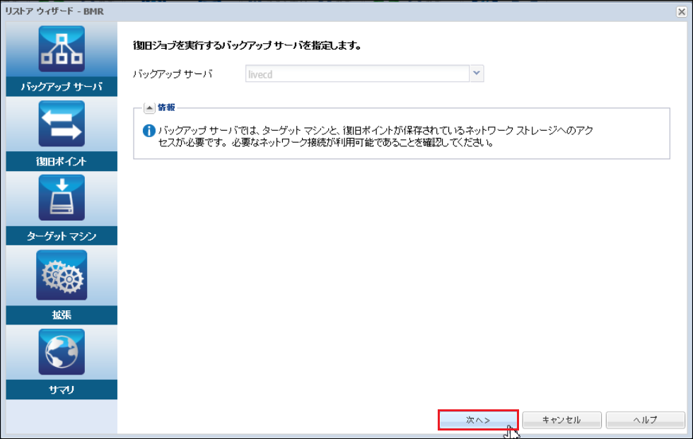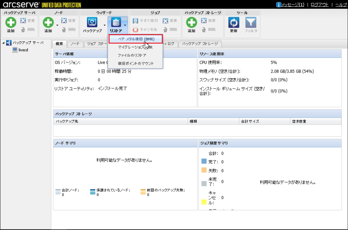 10.[リストア]をクリックし、[ベアメタル復旧 (BMR)]を選択します。