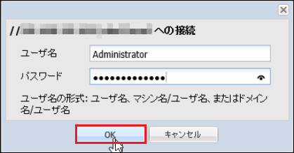 14.バックアップ保存先ストレージとなるサーバーインスタンスの接続許可を求められるので、「ユーザ名」、「パスワード」を入力し[OK]をクリックします。