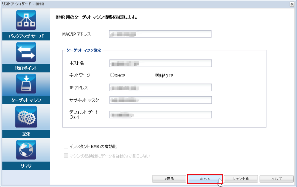 デフォルトゲートウェイ:最終的にリストアされるサーバーに設定するデフォルトゲートウェイアドレス