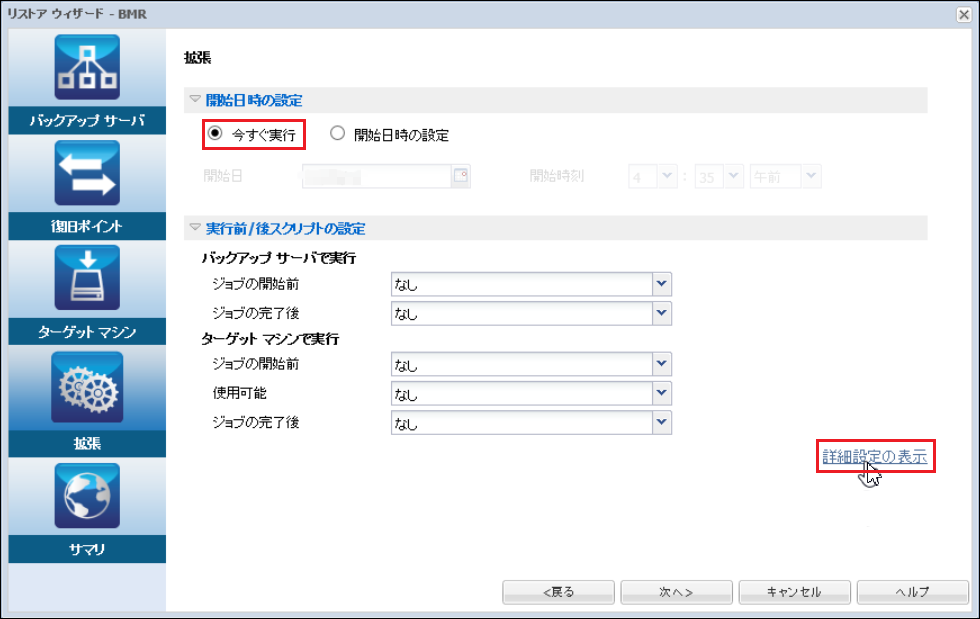 19.開始日時の設定にて、[今すぐ実行]を選択し、[詳細設定の表示]をクリックします。
