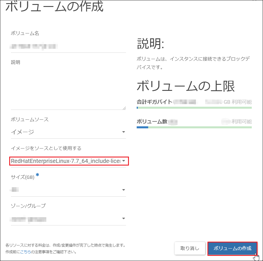 3.以下を入力/選択しボリュームの作成をクリックします。